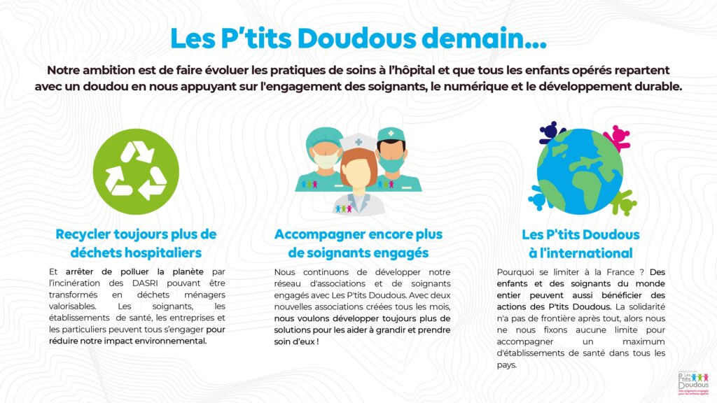 D’ici 2030, l’objectif est que chaque enfant opéré soit accompagné par Les P’tits Doudous, soit un million d’enfants par an en France.