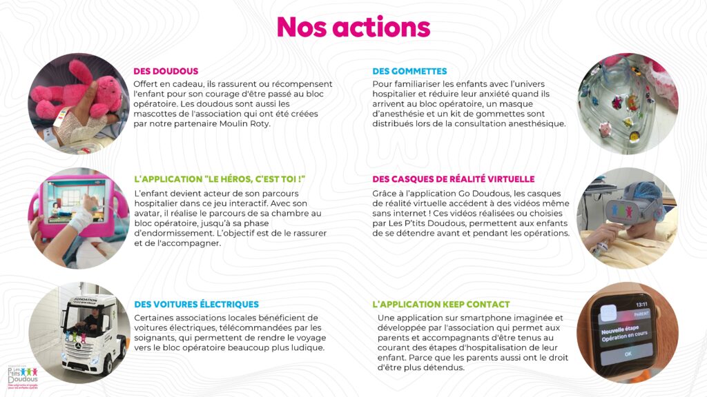 Initialement engagée pour réduire l’anxiété des enfants opérés en leur offrant des doudous pour les réconforter avant leur intervention chirurgicale, l’association a évolué avec une mission plus large visant à améliorer l’accueil des jeunes patients et diminuer leur stress préopératoire grâce à des actions innovantes :