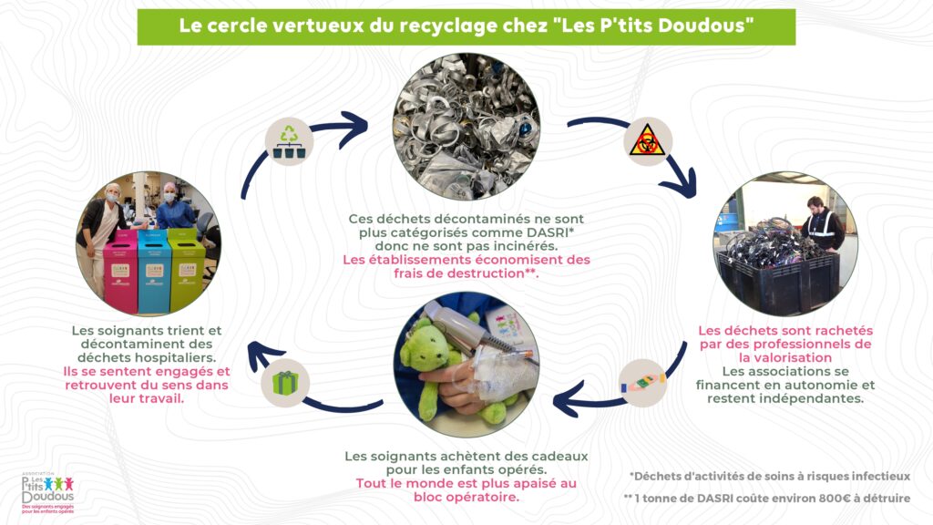 Le financement des actions de l’association provient du recyclage des déchets hospitaliers. En triant et valorisant des matériaux tels que les fils de bistouri électrique et les lames de laryngoscope, Les P’tits Doudous ont pu financer les doudous et continuer à développer de nouveaux projets. Ce système de recyclage permet également de réduire les coûts de gestion des déchets hospitaliers, car les déchets infectieux sont plus coûteux à traiter que les déchets ménagers.